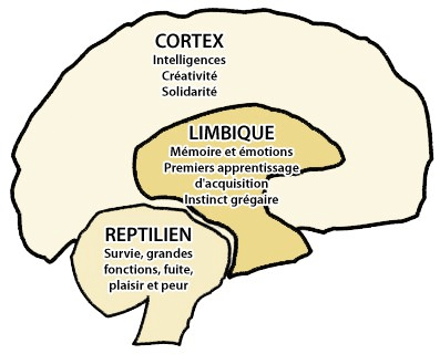 - Le reptilien : c’est la partie du cerveau où sont stockés nos instincts de survie.