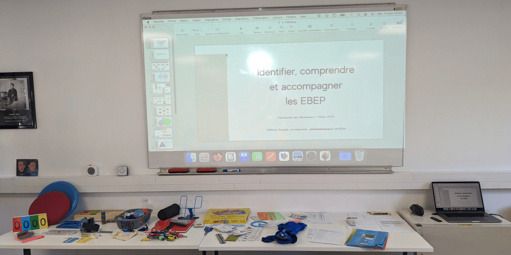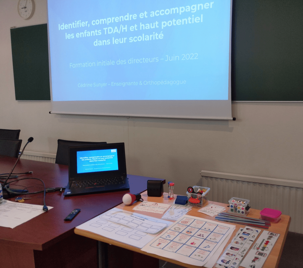 Je donne des formations aux directeurs et à tout personnel de l’éducation nationale sur les Élèves aux Besoins Éducatifs Particuliers. L’objectif est d’allier l’apport de connaissance sur les divers Troubles Neuro-Développementaux et la présentation d’outils pratiques, de matériel et d’astuces pour compenser, palier et accompagner au mieux ces élèves dans leur quotidien de classe.